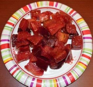 Koorida ja tükeldada üks keskmise suurusega (2,5-3 naela ehk 1-1,5 kg) kaalikas ja 3 keskmise suurusega peeti. Kaalikakuubikud võiks olla umbes 2x2x2 cm suurused, peedikuubikud poole väiksemad. Järgmiseks segada 200 grammi head oliiviõli või viinamarjaseemneõli sisse ürte – tüümiani, basiilikut või maitseainesegu (näiteks Trader Joe’s 21 Seasoning) ning kallata segu kaalika- ja peedikuubikute peale ning segada korralikult läbi, et kõik tükid oleks igast küljest õliga kaetud. Kallata juurviljasegu kaanega ahjupotti ja hautada 2 tundi 350-kraadises ahjus, vahepeal paar korda segades.