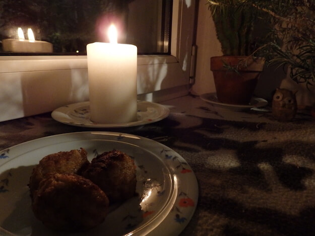 On this particular night, the first Sunday in November, a little girl decided it was the right time to light a candle in the window and invite her Papa home. We were having liha/pallid (meatballs), so some were left out for him all night as well.