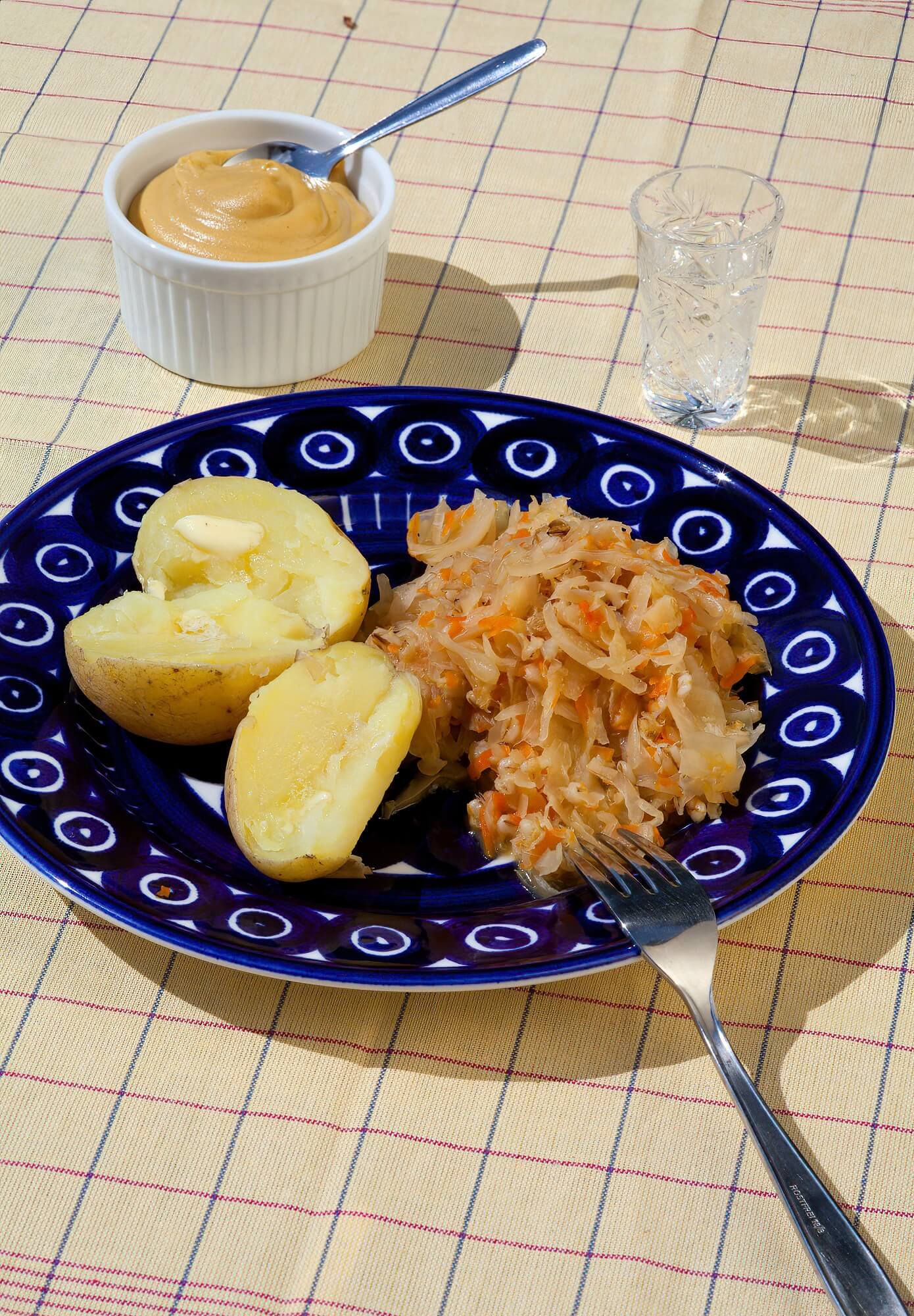 - Place the sauerkraut and carrots in a pot and add enough water to cover the vegetables, plus a little more.