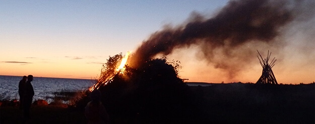 Vaatamata valjule tuule süüdati Koguva sadamas Muhu saarel tänavusel muinastulede ööl 27. augustil võimas lõke. Vett oli lähedalt võtta ja tulel hoiti silm pikalt peal. Taevas mere kohal veel kumas ja vasakul, Saaremaa idarannikul, hakkasid pea paistma sealpoolsed lõkketuled. Foto paremas ääres, suitsu seest paistavad püstilaotud mõrravaiad, mida kogenematu linnainimene esialgu ekslikult püstkodadeks pidas.
