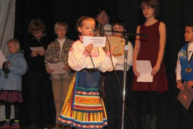 Baltimore Eesti Kooli õpilased esinemas. Katelyn Fullerton loeb: „Mina olen Lydia Koidula…”. Foto: Mare Saar