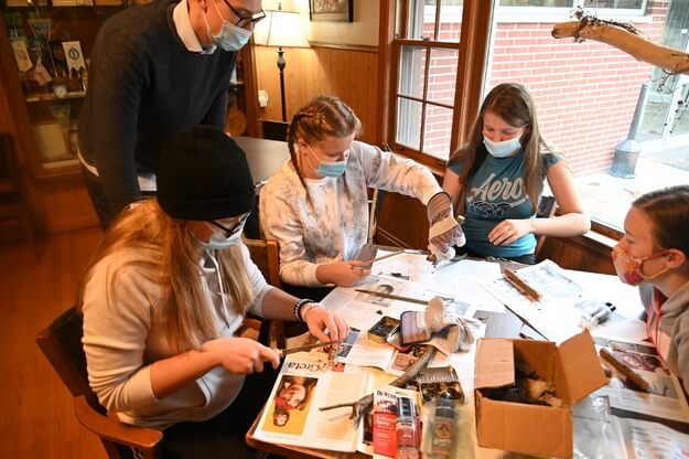 Chicago Eesti Kooli klass Kratid usinalt meisterdavad Eesti muinasaja tööriistu õpetaja Karli juhendamisel. Foto: Dr. Bernhard W. Adams.