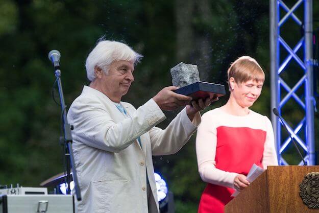Vabariigi President Kersti Kaljulaid andis Kadriorus toimunud iseseisvuse taastamise 27. aastapäevale pühendatud vastuvõtul laulja Ivo Linnale üle iseseisvuse taastamise tänukivi.