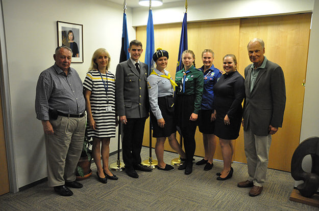 Pildil vasakult paremale: EABSi esimees Priit Parming, EV Peakonsul NYs Kairi Künka, kotkajuht Romet Pazuhanits, kodutütarde juht Birgit Sitska, skautjuht Killu-Marie Kell, gaidjuht Miia Kraun, Eesti ÜRO missiooni asejuht Minna-Liina Lind ja EABSi aseesimees Jüri Tint. Foto: Siiri Lind