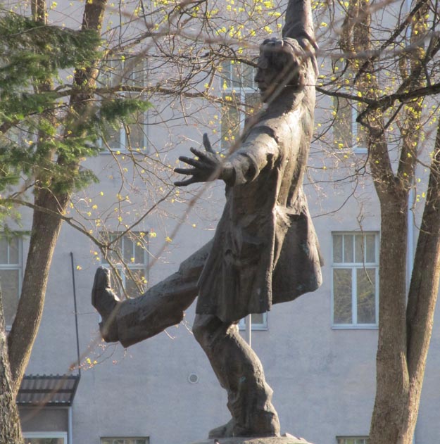 Veel üks vihje: selline tähtsate meeste kokkupuutepunkt tänavanurga näol asub ka antud linnas. Eelmise pildiallkirja luuletuse esiread ongi Ernst Enno sulest. Veel on antud linna pargis suht hiljuti taastatud Vabadussõja ausammas, mille Amandus Adamsoni 1925. a. loodud pronksfiguuri rekonstruktsiooni teostas skulptor Jaak Soans. Sammas kannab ka nime Julius Kuperjanovi monument, kuna lähedal toimunud Paju lahingus sai eesti väejuht surmavalt haavata 31.01.1919. (Kuperjanovite algne perekonnanimi oli Kupper. Venemaale elama minnes venestati see sealsete ametnike poolt Kuperjanoviks.) Sambal on Juhan Liivi luuletuse “Ta lendab mesipoole poole” neljanda salmi sõnad: “Ja puhugu wastu sull’ surmatuul ja lennaku wastu sull’ surmakuul. Sa unustad waewa ja hoole ning tõttad isamaa poole”. Mis linnaga on tegu?
