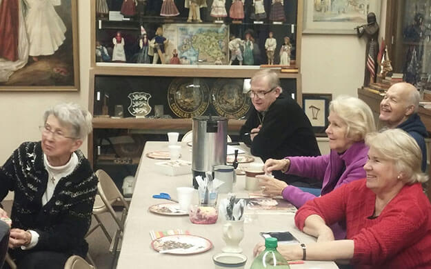 2015.a detsembri lõpus külastas meid Leevi Reinaru (laua otsas, mustas jakis), Lääne Nigula Püha Nikolause koguduse õpetaja ja Lääne praostkonna abipraost Eestis. Fotol ka (vasakult paremale) EAÜ president Enda Mai Michelson Holland, EAÜ kuraator Eda Taps ja sekretär Airi Vaga. Taamal Juhan Urm. Laudkond vaatab videolõiku Arhiivi ehitamisest, mis kerkis talgukorras kohalike eestlaste poolt. Foto: Ave Maria Blithe
