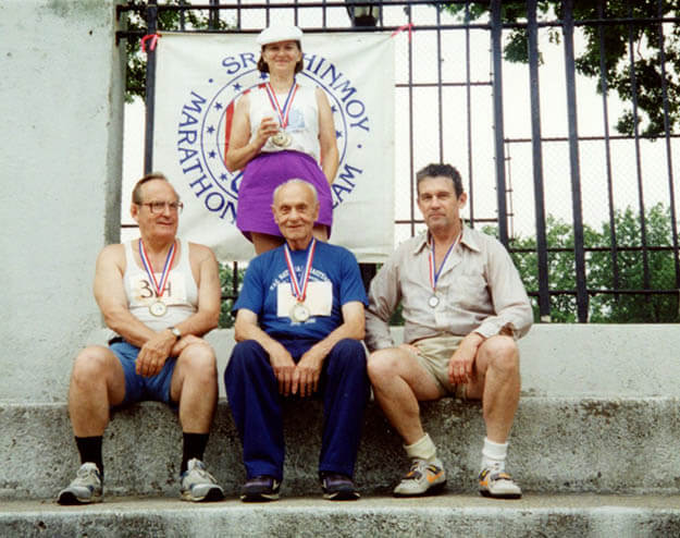 sportlasedGuru Sri Chimoy korraldatud spordivõistlustel Queensis said auhinnalisi kohti ka eestlased. Seisab Lii Maasik, istuvad vasakult: Voldemar Vaher, Alfred Skonberg, Meeme Maasik. 16. juuli 1994.  Foto: Virve Vaheri kogust