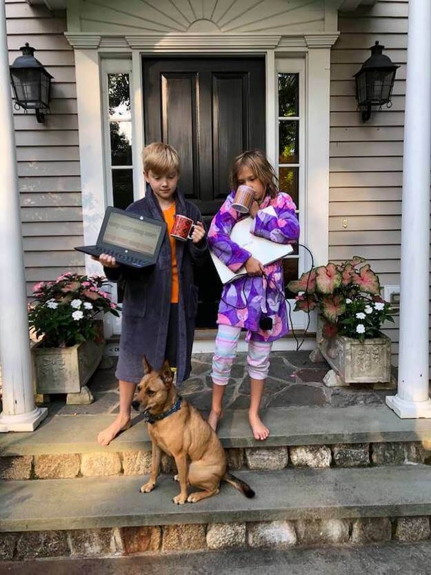 New Yorgi Eesti Kooli õpilased Sassu ja Ella Barborak Connecticutist oma esimesel koolipäeval, Ameerika koolis on nad nn hübriidõppel, Eesti kool alustab distantsõppega. Foto: Merike Barborak
