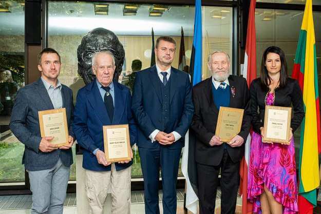 Välisminister Urmas Reinsalu kutsus välisministeeriumisse tänuüritusele Balti Apellile allakirjutanud mehed. Kohal olid vabadusvõitlejad Enn Tarto ja Mart Niklus (fotol koos välisministriga) ning Erik Udami ja Endel Ratase lähedased. Foto: välisministeerium