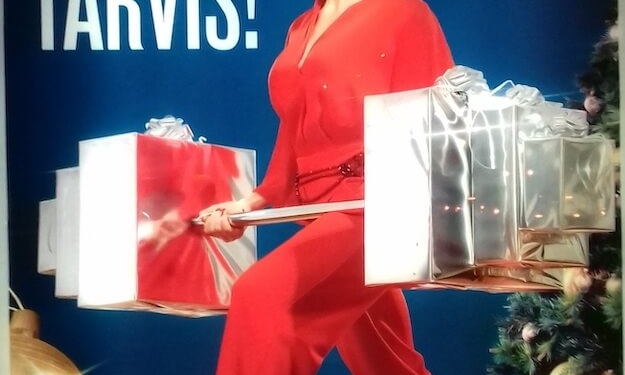 Back to the ad. These flashy, strong women in bright red jumpsuits are all over town and probably the country, tõstes kangi (pumping iron). The biggest are on banners adorning the original flagship Tallinna Kaubamaja department store (opened in 1960), which is the source of the Christmas ad. She’s on ekraanid (screens) in a frontal shot, doing a biitseps curl and on valgus/vitriinid (lit advertising panels), including bussi/-oote/paviljonid (bus shelters) lunging forward. She’s holding a kang (barbell) with HEAVY silver-wrapped presents on either end as raskused / kettad (weight/bumper plates). The sport of weightlifting, in which women started competing at the Olympic level in 2000, is known simply as tõstmine (lifting) and the person competing in the event is a tõstja. Single weights or dumbbells are hantlid and a barbell is a kang, which in competition can be lifted by rebimine (snatch) or tõukamine (clean and jerk). I suspect she might be in the women’s official weight category of up to 58 kg, but she’s SO not wearing the proper shoes.