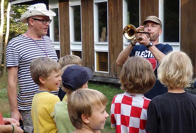 All all-laagri (sub-camp) groups say thanks for their meal in different ways at the Kotkajärve köök (kitchen), including traditional songs and unique hüüud (cheers). The hundud (cubs) definitely have the noisiest expressions of thanks: they have sent vee/raketid (pressurized water bottle rockets) shooting off into the sky and have also grabbed pillid (musical instruments). Showing off his trompet (trumpet) prowess is hundude all-laagri juht (head of cub camp) nskm Peter Türk with abi-juht (head assistant) Marcus Tamm looking on. Another co-leader, Sirli Arumäe from Eesti, has her kannel (zither) along. Stay tuned for more originality. Photos and texts: Riina Kindlam