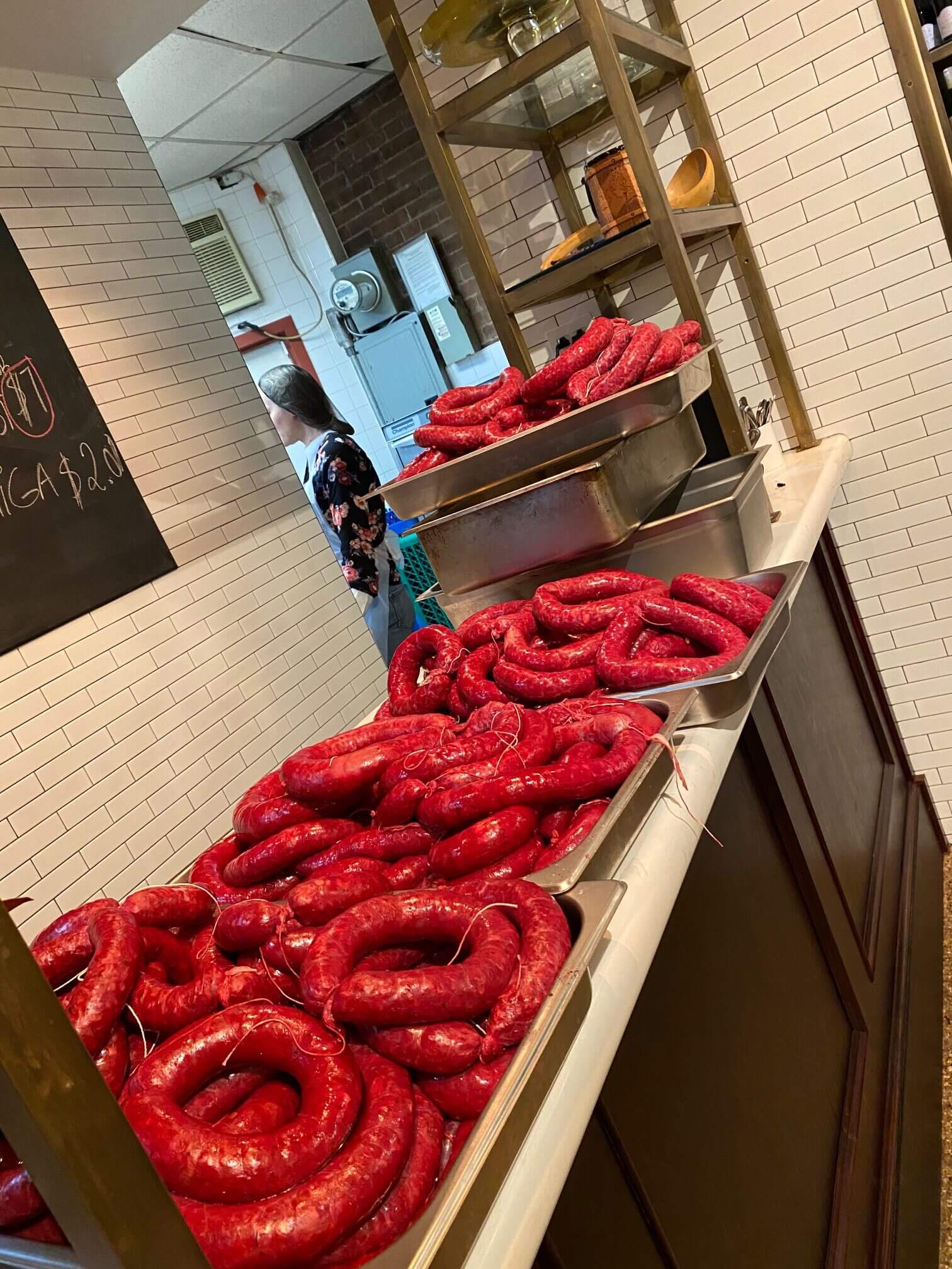 While many have family traditions of making blood sausages, coming together at the New York Estonian House offers a different slice of community. Around the room, the age ranges from teenagers to grandmothers as participants suit up in black hair nets and white plastic aprons and gloves, preparing to slide intestines onto funnels and machines. “I have been running this workshop for about five years now,” Liisi says. “But my brother, Siim, ran the workshop for fifteen or twenty years before me.” Liisi asks her mother, sitting next to her, if that sounds right, and she smiles at the man across the table, who she says has been making sausage with them for at least ten years.