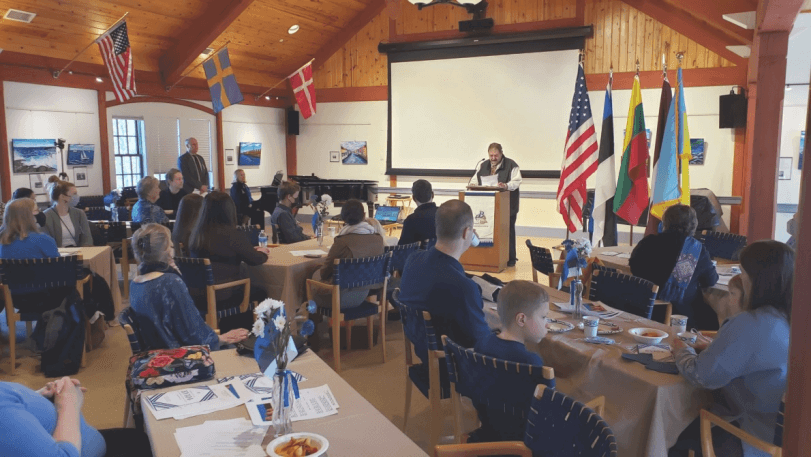 From the Ukrainian rally, the Estonian group proceeded to the Scandinavian Center for the formal celebration of Estonian Independence Day-/Vabariigi Aastapäeva aktus. Even though Covid restrictions were still in effect, Nordic Hall was filled with people gathered around clusters of decorated small tables. Flanking the podium was a Ukrainian flag next to a display of the American flag with the traditional triad of Baltic flags.