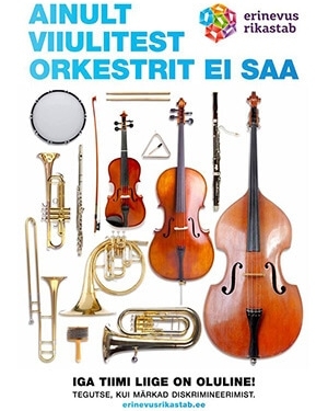 The poster says “You can’t make an orchestra out of only violins”, “Every member of the team is important!” and “Tegutse, kui märkad diskrimineerimist” – “Do something, if you witness discrimination”.